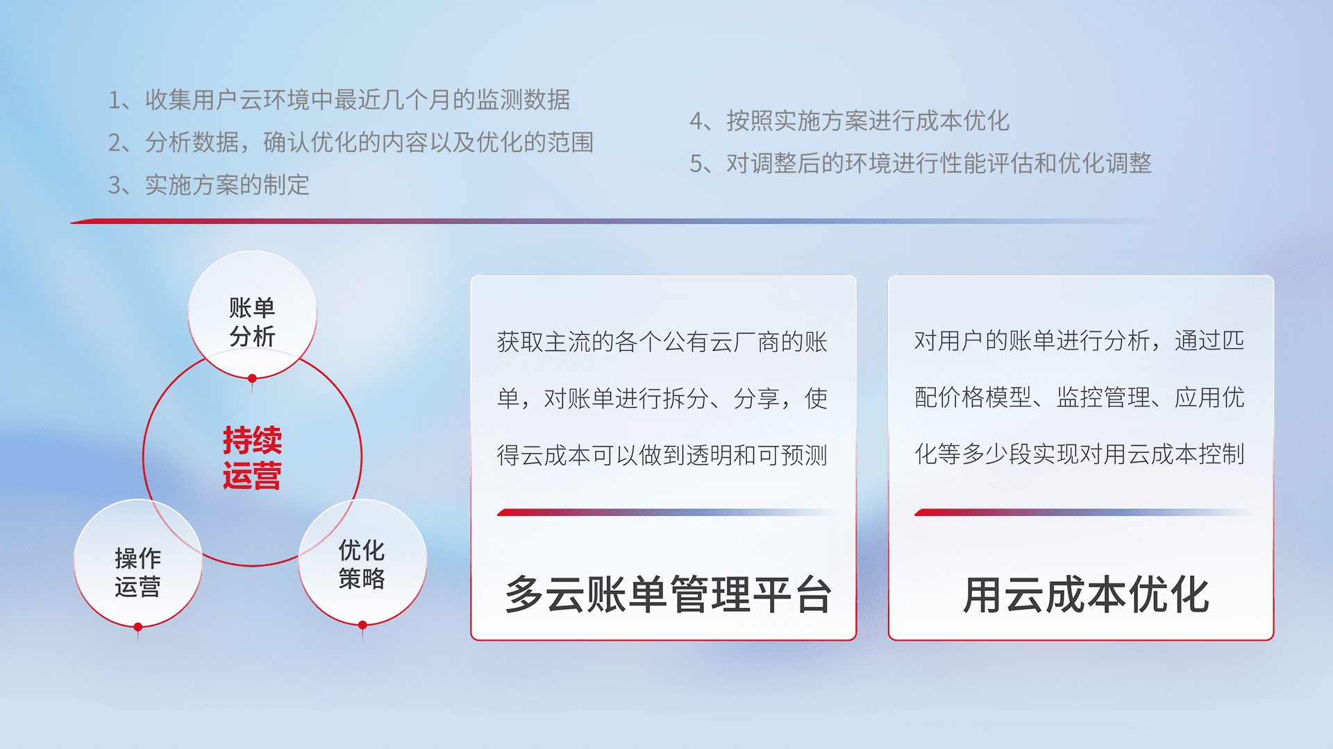 通过多云纳管,,,以统一的资源数据模型把客户的云资源进行抽象和封装,,,,进而实现对多云资源的统一操作,,,保障云资源管理的可靠性、、稳定性与可用性。。量身定制化运维内容,,,配置、、、、开发运维、、、、补丁管理、、、备份、、监控、、、、认证和访问管理、、、、审计和日常巡检等,,保障在用云过程中的可靠度,,,稳定度以及高可用率。。。