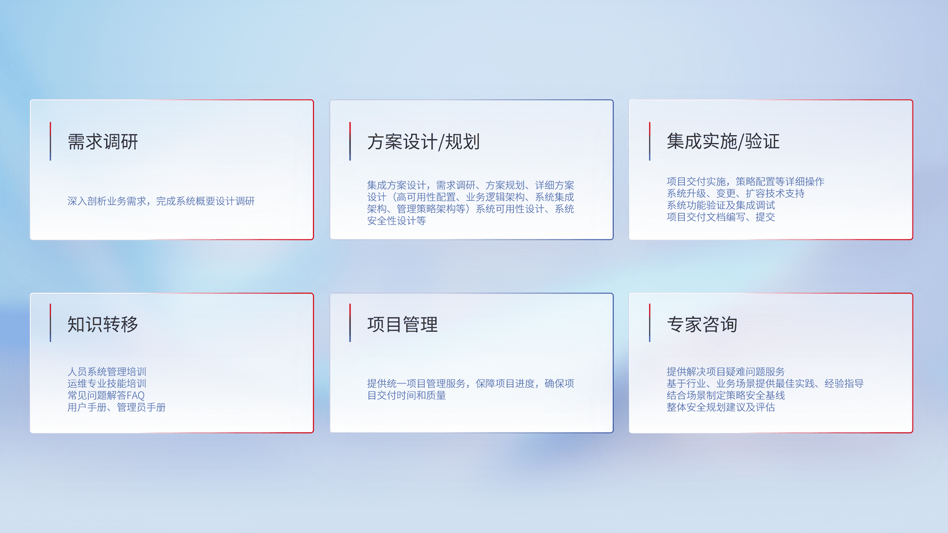 针对客户行业特性,,,将宏观的安全战略和需求,,通过专业的交付服务,,,,实现项目落地,,,为客户提供标准规范的集成交付服务。。